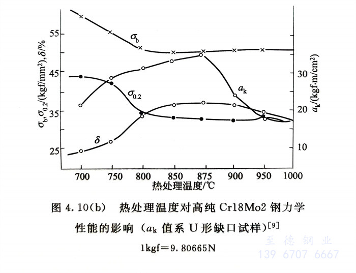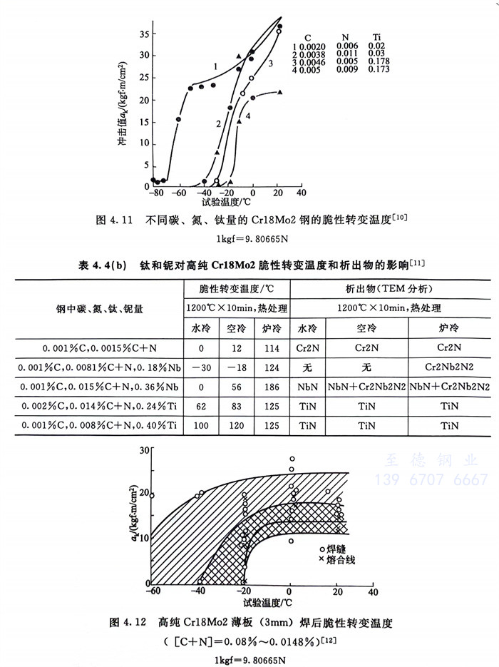 一(yi)些結(jie)果見(jian)圖(tu)(tu)(tu)4.10(b)~圖(tu)(tu)(tu)4.12。可(ke)以(yi)看出,適宜的(de)熱(re)處理可(ke)以(yi)獲得滿意的(de)塑、韌性[圖(tu)(tu)(tu)4.10(b)];盡(jin)量降低鋼中的(de)碳、氮(dan)含量,適量的(de)鈦含量,可(ke)使此鋼的(de)脆性轉(zhuan)變(bian)溫(wen)度(du)降到-20℃以(yi)下(xia)(xia)(圖(tu)(tu)(tu)4.11);在模擬焊(han)接(jie)條件(1200℃×10min)并(bing)以(yi)不(bu)同(tong)速度(du)冷卻(que),所試驗的(de)高純(chun)Cr18Mo2鋼中僅含0.001%~0.002%C,但C + N含量均(jun)≤0.015%,不(bu)論是否添加(jia)穩定(ding)元素Ti、Nb,只要有氮(dan)化(hua)物析出,也(ye)同(tong)樣會顯著提高鋼的(de)脆性轉(zhuan)變(bian)溫(wen)度(du)[表(biao)4.4(b)],而薄截面(mian)尺寸(cun)(3mm)的(de)高純(chun)Cr18Mo2的(de)焊(han)接(jie)接(jie)頭(焊(han)縫和熔合線(xian))脆性轉(zhuan)變(bian)溫(wen)度(du)也(ye)可(ke)低于-20℃以(yi)下(xia)(xia)(圖(tu)(tu)(tu)4.12)。