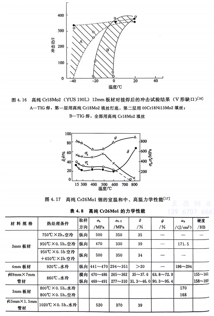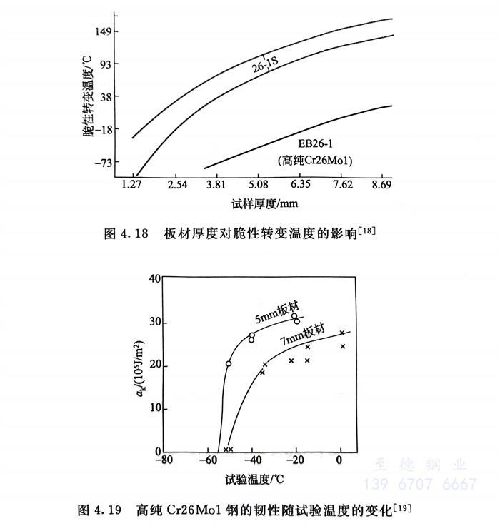 力學性能見圖4.17和(he)表4.8。脆性轉變溫度見圖4.18和(he)圖4.19。一(yi)般認為高(gao)純Cr26Mo1截面(mian)尺寸(cun)適(shi)用(yong)于≤6mm或≤7mm板、帶(dai)材(cai)、管材(cai)。