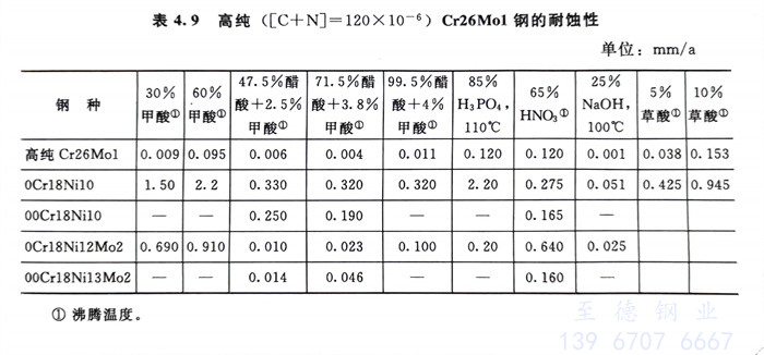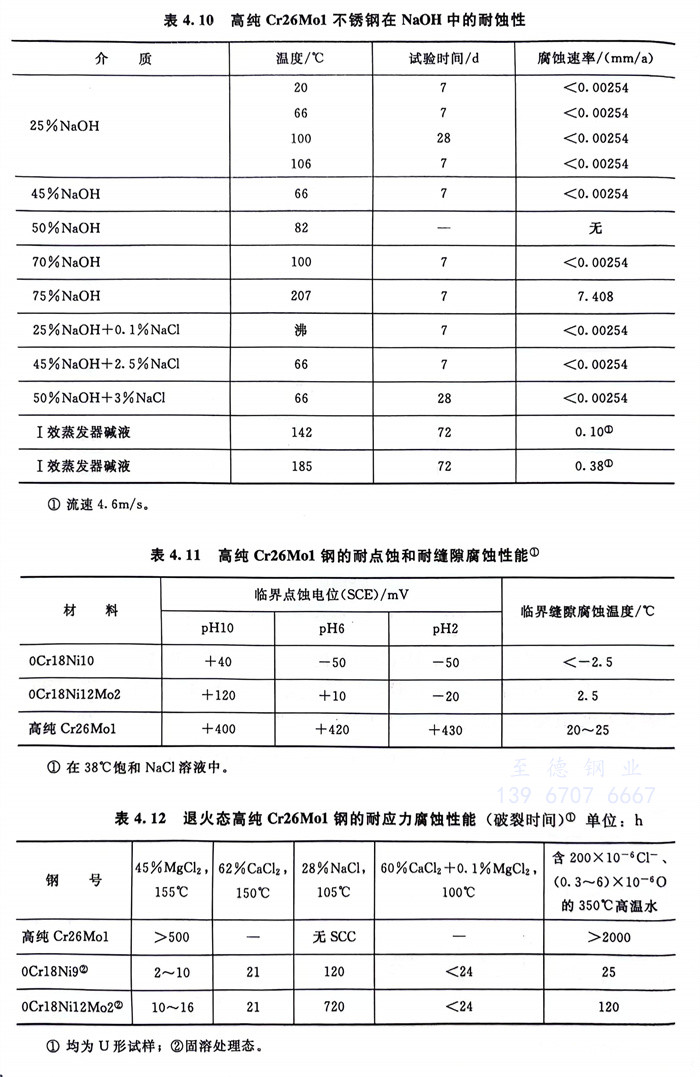 高純Cr26Mo1耐(nai)(nai)蝕性優(you)良,即使在65%沸騰HNO3和(he)NaOH中亦然(見表(biao)4.9和(he)表(biao)4.10);在耐(nai)(nai)點蝕、耐(nai)(nai)縫隙腐蝕、耐(nai)(nai)應力腐蝕等局部腐蝕中均既優(you)于0Cr18Ni10,也(ye)優(you)于0Cr18Ni12Mo2。一些(xie)結(jie)果見表(biao)4.11和(he)表(biao)4.12。