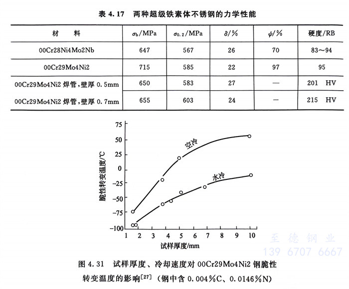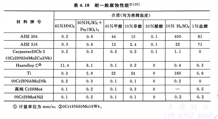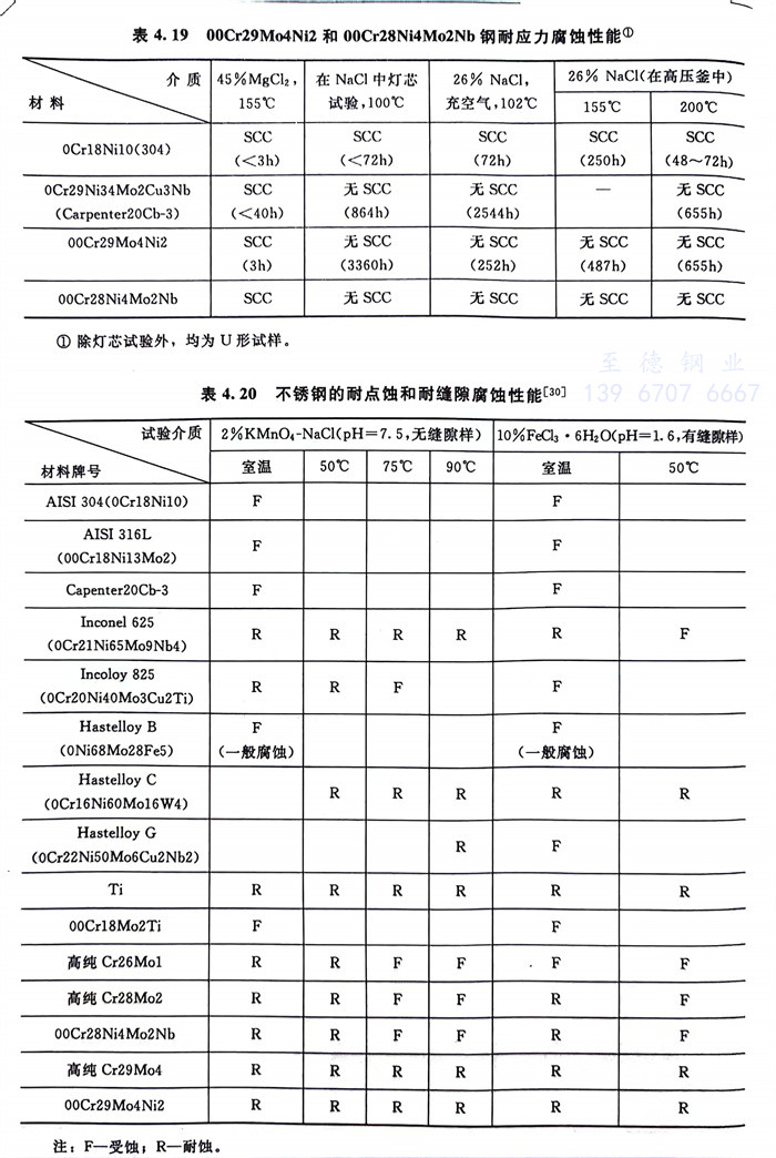 00Cr29Mo4Ni2和00Cr28Ni4Mo2Nb兩種超級鐵素體不銹鋼耐全面腐蝕、耐點蝕和縫隙腐蝕以及耐應力腐蝕的性能見表4.18~表4.20和圖4.33。