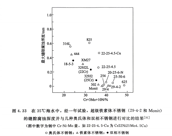 從表4.18~表4.20中的結果可看出00Cr29Mo4Ni2和00Cr28Ni4Mo2Nb具有優良的耐蝕性,在耐點蝕和縫隙腐蝕方面,00Cr29Mo4Ni2還優于00Cr28Ni4Mo2并且還超過了高鎳耐蝕合(he)金Capenter20Cb-3(0Cr29Ni34Mo2Cu3Nb)和Inconel 625(0Cr21Ni65Mo9Nb4)。從圖4.33在實際海水中一年的試驗結果表明,超級鐵素體不銹鋼29-4-2(00Cr29Mo4Ni2),Monit(00Cr25Mo4Ni4),高純Cr30Mo2、Cr29Mo4(圖中302和29-4)均優于所有高牌號的奧氏體不銹鋼,且與超級奧氏體不銹鋼,如254 SMO(圖中254),00Cr20Ni25Mo6N(圖中20-25-6-N)以及高鎳耐蝕合金00Cr21Ni65Mo9Nb4(圖中625)相比,耐蝕性也相同或稍優。