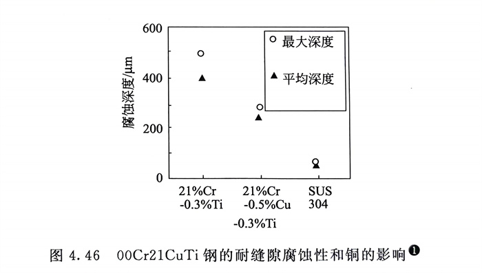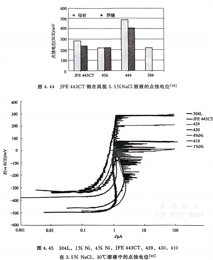 JFE所(suo)進行的JFE 443CT耐(nai)縫(feng)隙腐(fu)蝕的試驗(yan)結果見圖4.46中(zhong),一方面表明在(zai)相同試驗(yan)條件下(xia),含0.5%Cu的00Cr21Cu0.5Ti(JFE 443CT)較不(bu)含銅者耐(nai)縫(feng)隙腐(fu)蝕性顯著提高,但(dan)也(ye)指出,00Cr21Cu0.5Ti(JFE 443CT)鋼的耐(nai)縫(feng)隙腐(fu)蝕性要低于SUS 304,也(ye)說明了鎳在(zai)不(bu)銹鋼中(zhong)耐(nai)縫(feng)隙腐(fu)蝕性能(neng)的良好作用。
