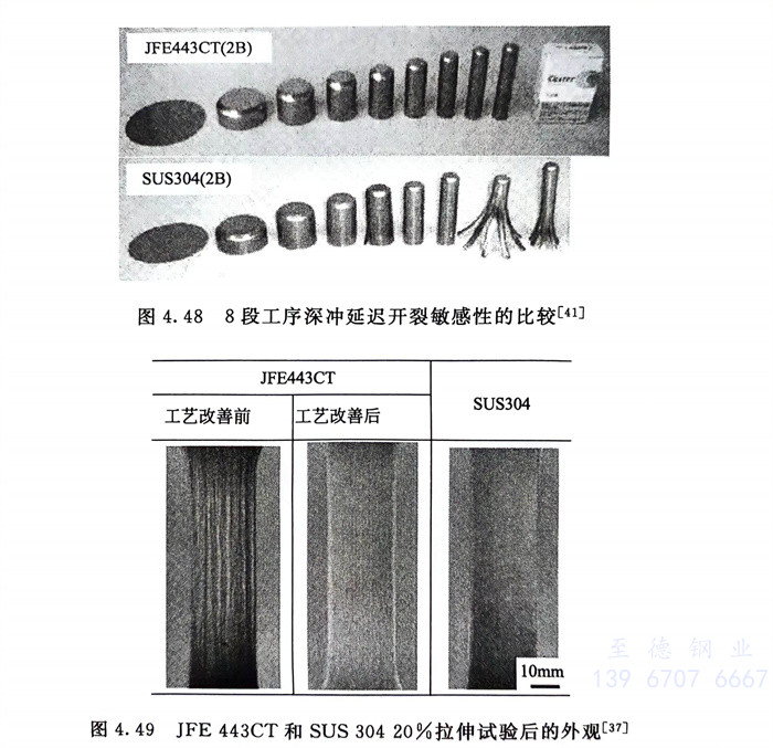 圖(tu)4.47 443、439和304以及1%Ni、4%Ni鋼(gang)(gang)(gang)延(yan)(yan)(yan)遲(chi)斷裂敏(min)感性(xing) ,圖(tu)4.48則系(xi)一種產品分8段進行深(shen)沖加工(gong),深(shen)沖比達5~6高應(ying)變條(tiao)件下的(de)試驗(yan)結果(guo)。可以看出(chu)(chu)JFE443CT鋼(gang)(gang)(gang)并未(wei)出(chu)(chu)現(xian)延(yan)(yan)(yan)遲(chi)開裂而(er)SUS 304不銹鋼(gang)(gang)(gang)在第7段冷(leng)加工(gong)后便出(chu)(chu)現(xian)了開裂。說明了SUS 304鋼(gang)(gang)(gang)的(de)延(yan)(yan)(yan)遲(chi)斷裂敏(min)感性(xing)要(yao)高于JFE 443CT鋼(gang)(gang)(gang),一般認為奧氏體不銹鋼(gang)(gang)(gang)延(yan)(yan)(yan)遲(chi)開裂敏(min)感性(xing)高的(de)原因與冷(leng)加工(gong)大(da)變形區域的(de)延(yan)(yan)(yan)伸還(huan)存(cun)在二次硬化和二次加工(gong)脆化有關(guan)。