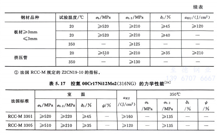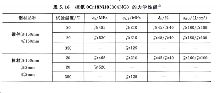 控(kong)氮(dan)0Cr18Ni10(304NG)和控(kong)氮(dan)00Cr17Ni12Mo2 (316NG)的(de)力學性能分別列人表5.16和表5.17中(zhong)。