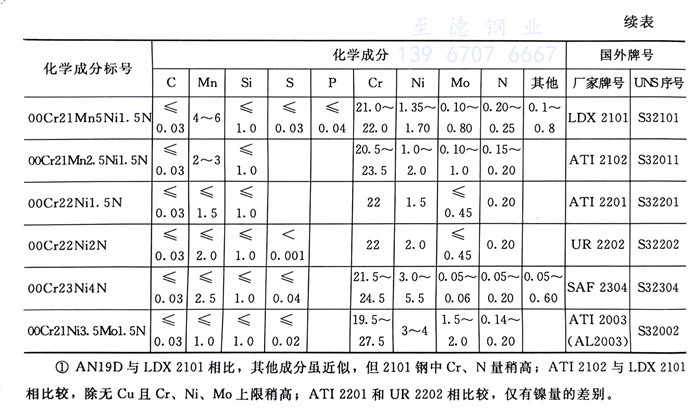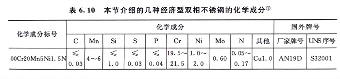 經濟型雙相不銹鋼系指現代雙相不銹鋼中低鎳無鉬和少鉬的那些牌號,其中的幾個主要牌號及其化學成分列入表6.10中。除00Cr23Ni4N(SAF 2304)外,多種經濟型雙相不銹鋼管都是2000年以來陸續面世的。例如,AN19D (00Cr20Mn5Ni1.5N),LDX 2101 (00Cr21Mn5Ni1.5N),ATI 2101(00Cr21Mn2.5Nil.5N), ATI 2201 (00Cr22Nil.5N),UR 2202(00Cr22Ni2N),SAF 2404和 ATI 2003 (00Cr21Ni3.5Mo1.5N)等,本節僅對表6.10中所列牌號進行扼要介紹。