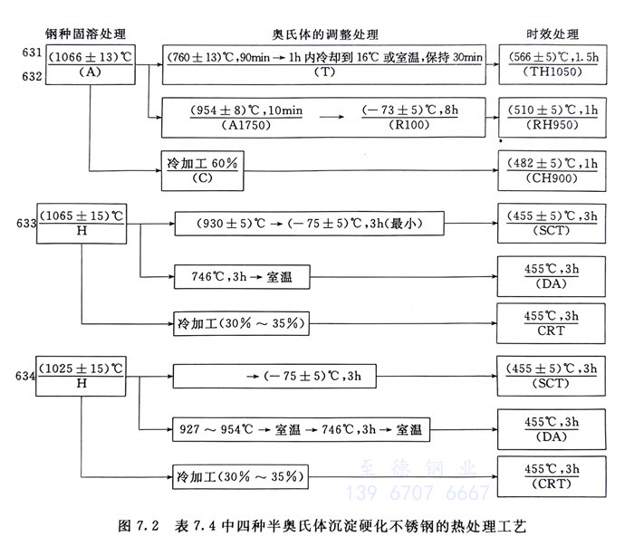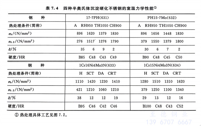 表7.4列入了四種半奧氏體沉淀硬化(hua)不銹鋼(gang)不同熱處理狀態的力學性能熱處理的具體工藝見圖7.2。