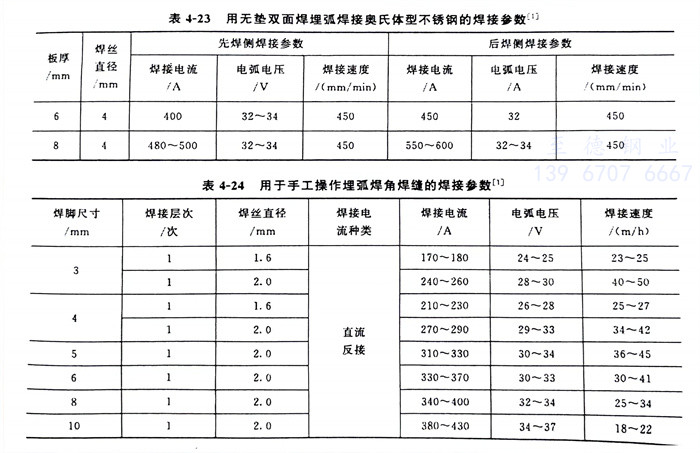 半(ban)(ban)自動(dong)埋(mai)弧(hu)(hu)焊(han)(han)(han)接(jie)(jie)不銹鋼管工(gong)藝適用于(yu)一(yi)般機械操作埋(mai)弧(hu)(hu)焊(han)(han)(han)焊(han)(han)(han)接(jie)(jie)不到(dao)的(de)場(chang)合(he)。焊(han)(han)(han)接(jie)(jie)速度及均勻程度完全由焊(han)(han)(han)工(gong)手(shou)工(gong)操作控制(zhi)。半(ban)(ban)自動(dong)埋(mai)弧(hu)(hu)焊(han)(han)(han)進(jin)行間斷角焊(han)(han)(han)最(zui)理想。其(qi)焊(han)(han)(han)接(jie)(jie)生產效率(lv)比焊(han)(han)(han)條電(dian)弧(hu)(hu)焊(han)(han)(han)可提高5倍,而且焊(han)(han)(han)縫質量良好。半(ban)(ban)自動(dong)埋(mai)弧(hu)(hu)焊(han)(han)(han)焊(han)(han)(han)接(jie)(jie)奧氏(shi)體型(xing)不銹鋼的(de)角焊(han)(han)(han)縫時,其(qi)焊(han)(han)(han)接(jie)(jie)參數見(jian)表 4-24。