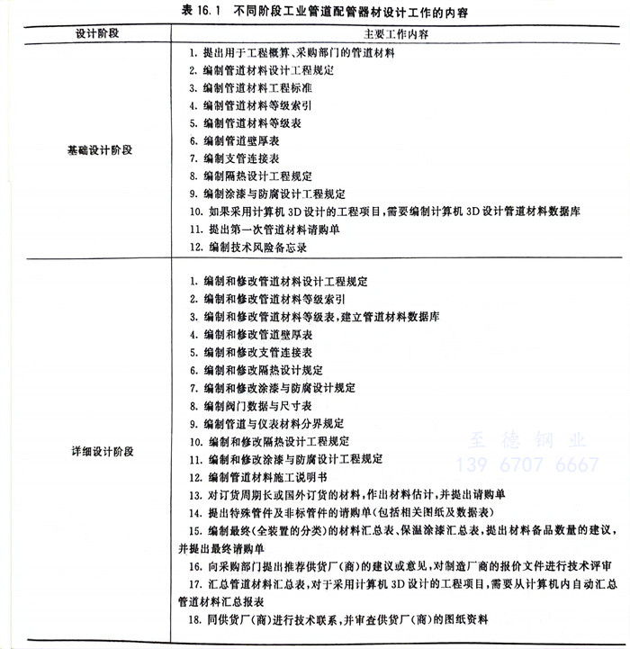 不同階段工業(ye)管(guan)道配管(guan)器材(cai)設計(ji)的工作的內(nei)容(rong)見表16.1。