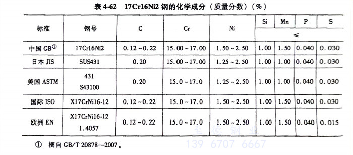 17Cr16Ni2、1.4057、431不銹鋼的化(hua)學(xue)成分見表(biao)4-62。
