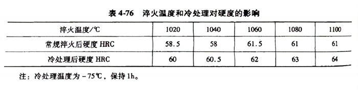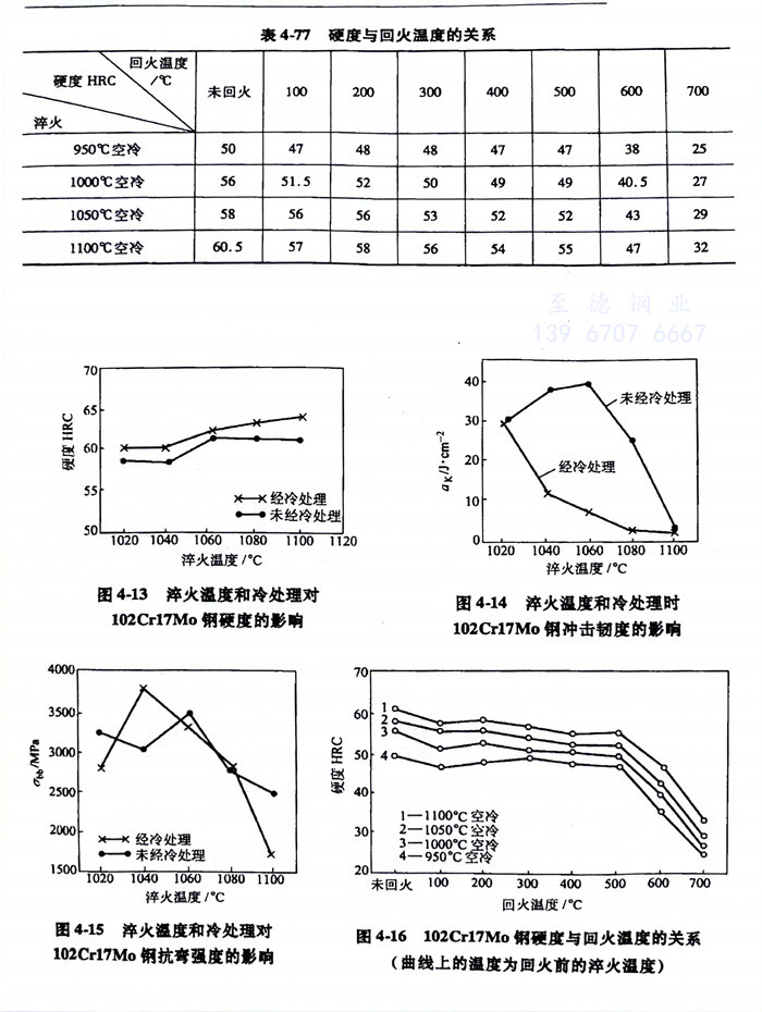 淬火溫度(du)(du)和(he)冷處(chu)理對(dui)硬度(du)(du)的影響見(jian)表4-76和(he)圖(tu)4-13,對(dui)沖擊韌度(du)(du)和(he)抗(kang)彎強(qiang)度(du)(du)的影響見(jian)圖(tu)4-14和(he)圖(tu)4-15;硬度(du)(du)和(he)回火溫度(du)(du)的關(guan)系(xi)見(jian)表4-77和(he)圖(tu)4-16。