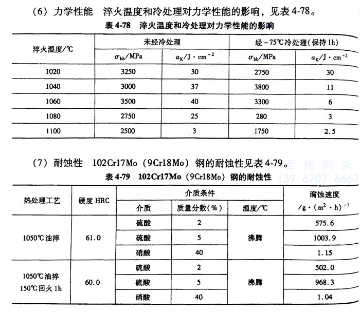 102Cr17Mo (9Cr18Mo)1.4125、440C不銹(xiu)鋼淬火溫度和冷處理(li)對(dui)力學性能的影響(xiang),見(jian)表4-78。