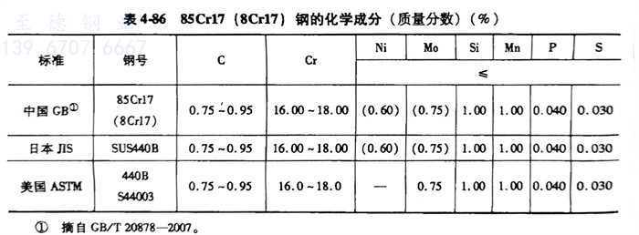 85Cr17(8Cr17)、S44003、SUS440B不銹(xiu)鋼的化學成分見表4-86。
