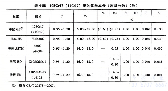 108Cr17(11Cr17)、1.4125、S44004、440C不(bu)銹(xiu)鋼(gang)的化學成分見表4-88。