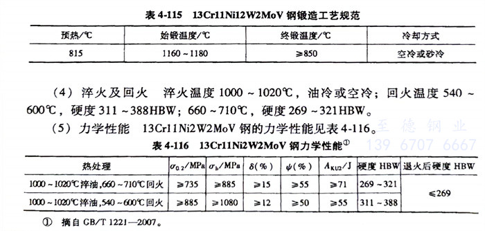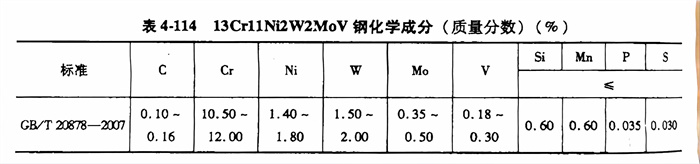13Crl1Ni2W2MoV(1Cr11Ni2W2MoV)不銹(xiu)鋼(gang)的化學成分見表4-114。