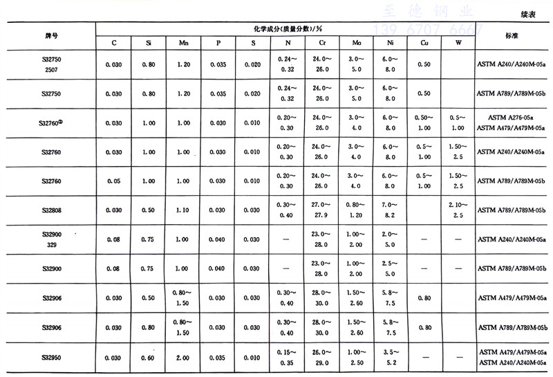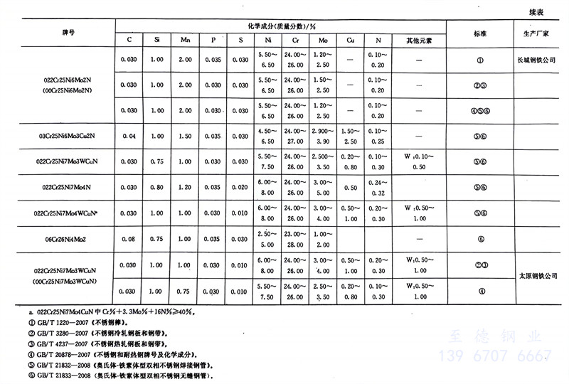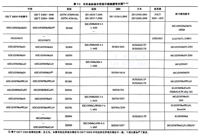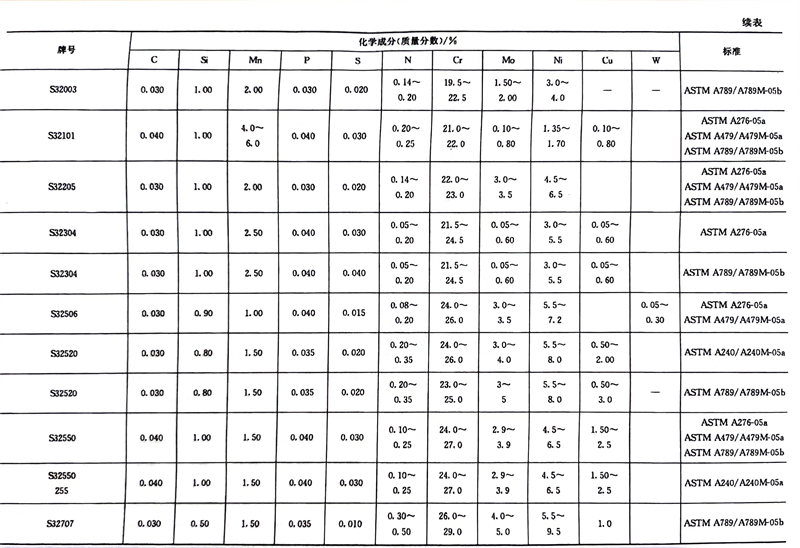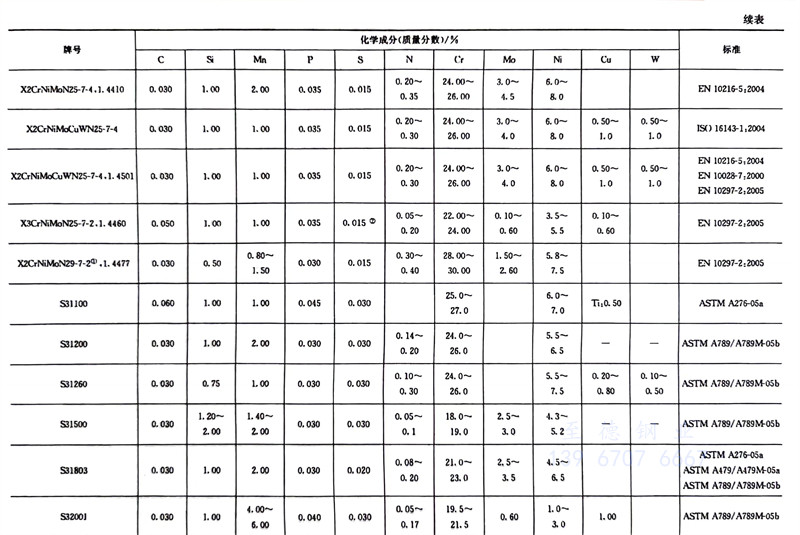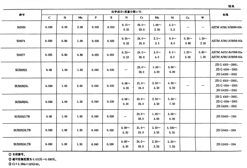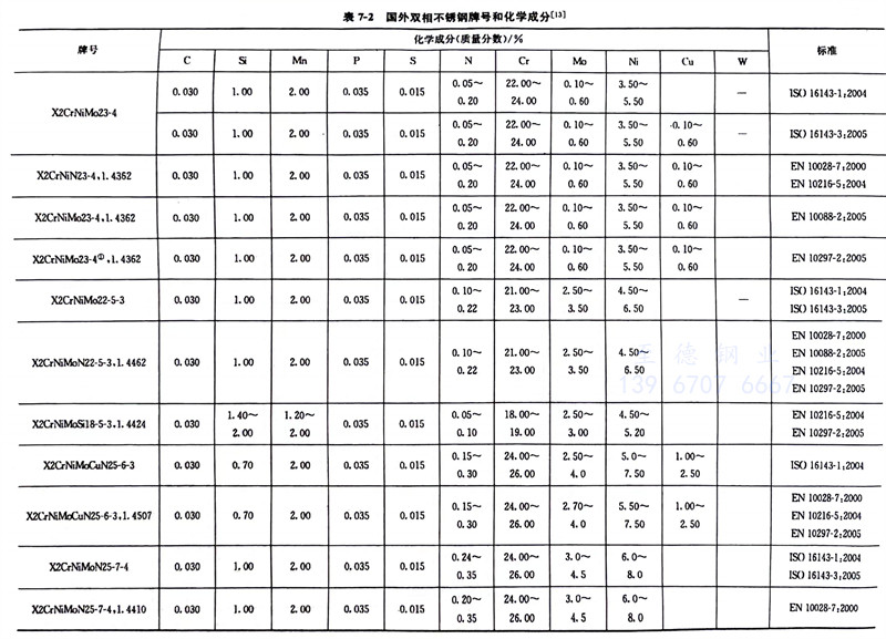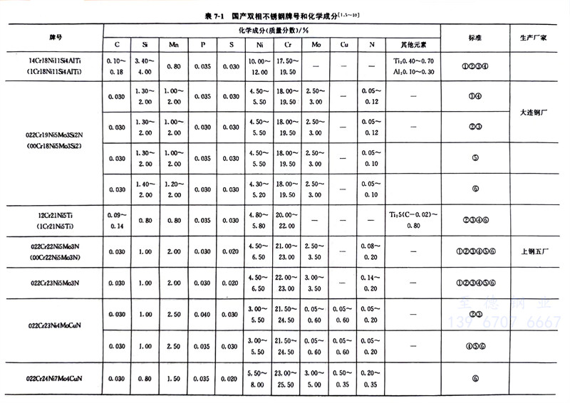 我(wo)(wo)國雙相(xiang)不(bu)(bu)銹鋼(gang)牌號(hao)(hao)和化(hua)學成(cheng)分見(jian)(jian)表7-1,力(li)學性(xing)能見(jian)(jian)表1-8,我(wo)(wo)國生產雙相(xiang)不(bu)(bu)銹鋼(gang)的企(qi)業見(jian)(jian)表7-1,國外常見(jian)(jian)雙相(xiang)不(bu)(bu)銹鋼(gang)牌號(hao)(hao)和化(hua)學成(cheng)分見(jian)(jian)表7-2,中外雙相(xiang)不(bu)(bu)銹鋼(gang)牌號(hao)(hao)對照見(jian)(jian)表7-3。