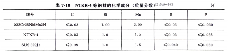 022Cr25Ni6Mo2N(原習慣牌號為00Cr25Ni6Mo2N)已納入 GB/T 1220、GB/T 3280、GB/T 4237、GB/T 20878、GB/T21832、GB/T 21833等標準中。該牌號材料為尿素用鋼,包括鋼板、焊接鋼管、無縫鋼管等。化學成分見表7-1。該材料與國外接近的雙相不銹鋼有日本的SUS329J1 不銹鋼(日本在1972年將SUS329J1納入JIS標準),日本金屬NTKR-4 不銹鋼,英國的Zeron25不銹鋼(鑄),美國的7-MoPLVS 不銹鋼,美國ASTM A789M、ASTM A790標準中牌號為S31200 不銹鋼。