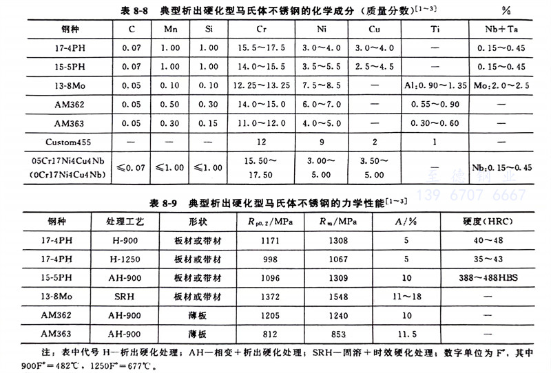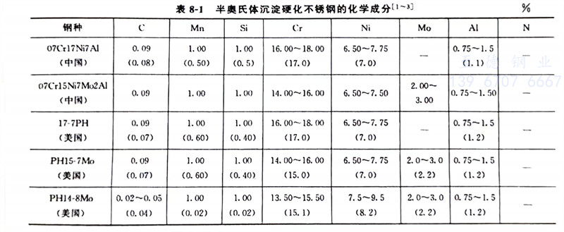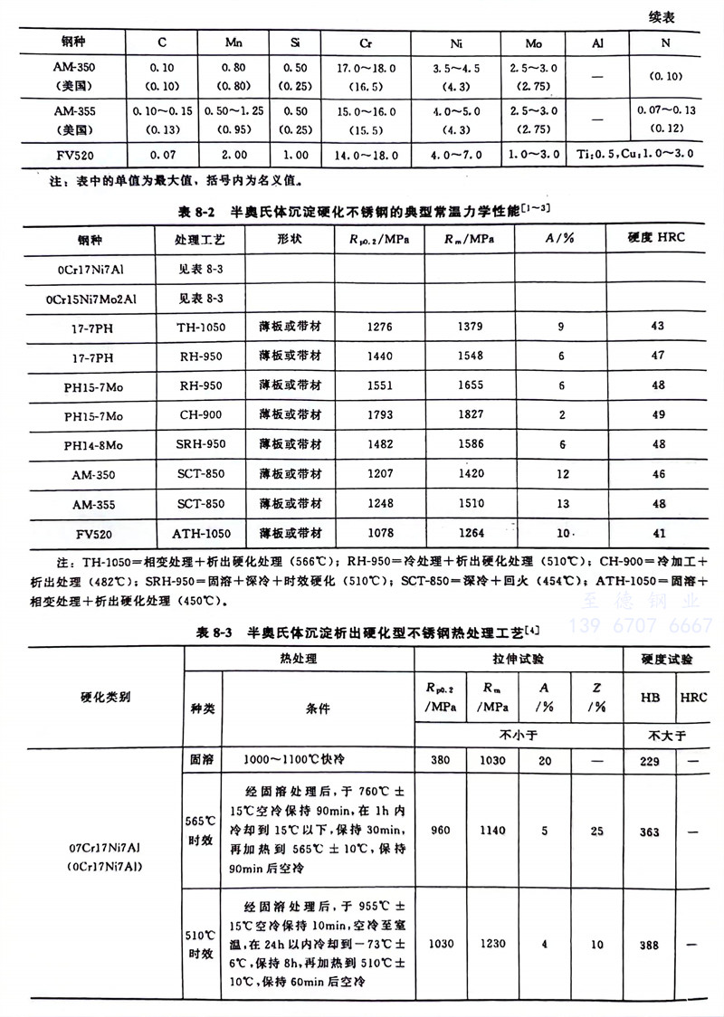 常(chang)見(jian)的半奧(ao)氏(shi)體沉淀硬化不銹鋼(gang)的化學成(cheng)分(fen)、力學性能分(fen)別(bie)見(jian)表8-1~表8-3。