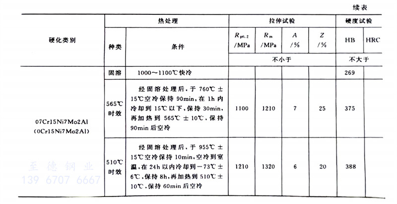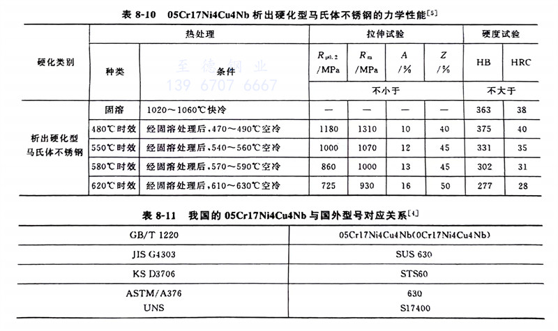 由于馬氏(shi)體(ti)沉(chen)淀(dian)硬(ying)(ying)化(hua)(hua)和時(shi)效(xiao)(xiao)(xiao)硬(ying)(ying)化(hua)(hua)均為析出(chu)硬(ying)(ying)化(hua)(hua),故(gu)此類鋼(gang)又稱為析出(chu)硬(ying)(ying)化(hua)(hua)型馬氏(shi)體(ti)不銹鋼(gang)。這類鋼(gang)含有在馬氏(shi)體(ti)中固溶度小的(de)Cu、Al、Mo、Ti、Nb等強化(hua)(hua)元素,經低溫回火后即可達到時(shi)效(xiao)(xiao)(xiao)強化(hua)(hua)的(de)效(xiao)(xiao)(xiao)果。常見(jian)(jian)馬氏(shi)體(ti)沉(chen)淀(dian)硬(ying)(ying)化(hua)(hua)型不銹鋼(gang)的(de)化(hua)(hua)學成分見(jian)(jian)表(biao)(biao)8-8、力學性(xing)能見(jian)(jian)表(biao)(biao)8-9、表(biao)(biao)8-10。我國的(de)05Cr17Ni4Cu4Nb與國外型號對(dui)應(ying)關系見(jian)(jian)表(biao)(biao)8-11。
