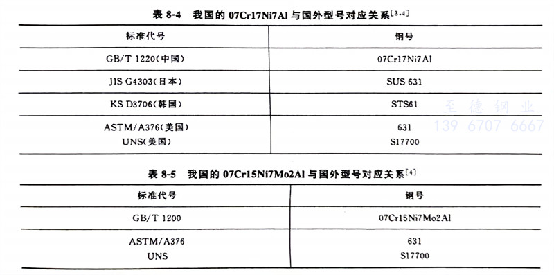 我國的07Cr17Ni7A1與(yu)國外(wai)型(xing)號(hao)對應(ying)關(guan)系(xi)見(jian)表8-4,我國的07Cr15Ni7Mo2Al與(yu)國外(wai)型(xing)號(hao)對應(ying)關(guan)系(xi)見(jian)表8-5。