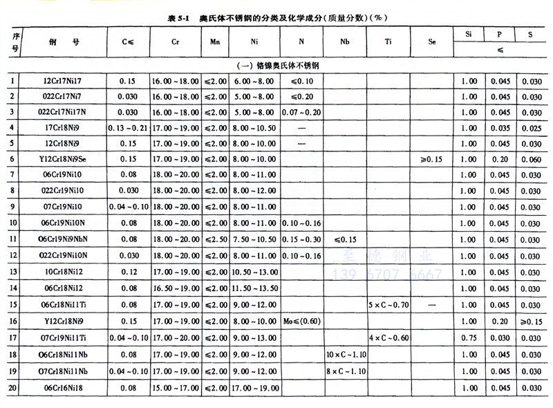 奧(ao)氏體不銹(xiu)(xiu)(xiu)鋼(gang)是不銹(xiu)(xiu)(xiu)鋼(gang)中(zhong)品種最多的,也是應(ying)用(yong)最廣泛的,在(zai)GB/T20878中(zhong)共有66種。本書(shu)按其化學成分和(he)(he)用(yong)途(tu)分為鉻鎳奧(ao)氏體不銹(xiu)(xiu)(xiu)鋼(gang)、鉻猛氮奧(ao)氏體不銹(xiu)(xiu)(xiu)鋼(gang)、鉬硅銅奧(ao)氏體不銹(xiu)(xiu)(xiu)鋼(gang)和(he)(he)耐(nai)熱奧(ao)氏體不銹(xiu)(xiu)(xiu)鋼(gang)。其分類和(he)(he)化學成分見(jian)表5-1。