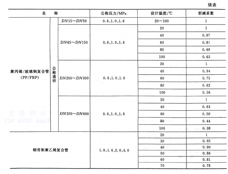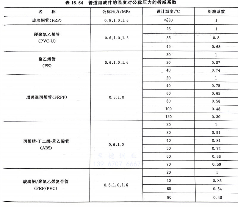 非(fei)金屬材(cai)料(liao)及其制品的(de)選用應考慮溫度對公稱(cheng)壓力的(de)折減(jian),折減(jian)系(xi)數(shu)見(jian)表16.64。鋼骨架(jia)聚乙烯(xi)復(fu)合管(guan)在輸送特殊危險性介質時,應將修正(zheng)后的(de)公稱(cheng)壓力再乘以0.8的(de)折減(jian)系(xi)數(shu)。
