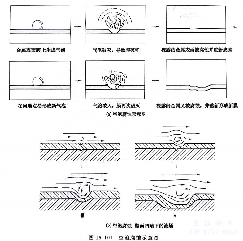 流體與金屬構件做高速相對運動,在金屬表面局部地區產生渦流,伴隨有氣泡在金屬表面迅速生成和破滅,呈現與孔蝕類似的破壞特征。這種條件下發生的磨蝕稱為空泡腐(fu)蝕,又稱空穴腐蝕或汽蝕。影響磨蝕的因素有金屬(合金)、表面膜、流速。磨蝕的控制:合理選材、改善設計、降低流速、除去介質的有害成分、覆蓋防護層和電化學保護等。但以合理選材和改善設計這兩種方法最為有效。