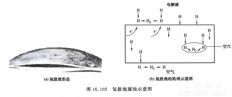 是指金屬材料中由于氫的存在或氫與金屬相互作用,造成材料力學性能下降的總稱。在含硫化氫的油、氣輸送管線及煉油廠設備常發生這種腐蝕。氫損傷分為四種不同的類型:氫鼓泡[圖16.102(a)]、氫脆、脫碳、氫蝕。氫鼓泡是指在某些介質中,由于腐蝕或其他原因而產生的氫原子滲入金屬,導致金屬局部變形,甚至完全破壞。氫脆是由于氫進入金屬內部,導致韌性和抗拉強度下降變脆,并在應力的作用下發生脆裂。脫碳即從鋼中脫出碳,常常是由于高溫氫蝕所引起的,導致鋼的抗拉強度下降。氫蝕是由于高溫下合金中組分與氫反應引起的。