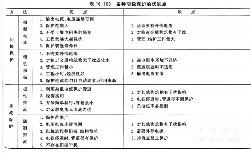各種陰極保(bao)護(hu)的優缺點見表16.163。