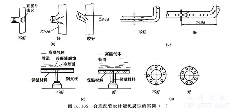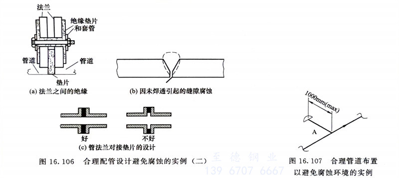 在(zai)設(she)計時(shi),為避(bi)免(mian)(mian)不合適的(de)(de)流(liu)(liu)動狀(zhuang)態對(dui)管(guan)(guan)(guan)道(dao)(dao)造(zao)(zao)(zao)成(cheng)磨損(sun)腐(fu)(fu)蝕,通常要求(qiu)流(liu)(liu)動狀(zhuang)態均勻,為避(bi)免(mian)(mian)流(liu)(liu)體通路斷面的(de)(de)急(ji)劇(ju)變化、不連續變化以及流(liu)(liu)動方向的(de)(de)急(ji)劇(ju)變化,應(ying)盡量抑(yi)制(zhi)流(liu)(liu)速差和壓力降,以免(mian)(mian)引起(qi)湍(tuan)流(liu)(liu)和渦流(liu)(liu)。管(guan)(guan)(guan)道(dao)(dao)在(zai)轉彎及三通處(chu)以及孔板(ban)流(liu)(liu)量計的(de)(de)安放位置處(chu)都應(ying)進行合理(li)設(she)計,盡量減少流(liu)(liu)體中(zhong)(zhong)固體顆粒的(de)(de)夾帶。圖16.105(c)左(zuo)圖是(shi)鋼(gang)支柱未(wei)保溫造(zao)(zao)(zao)成(cheng)的(de)(de)冷凝液(ye)腐(fu)(fu)蝕。對(dui)策是(shi)將鋼(gang)支架一(yi)起(qi)保溫,避(bi)免(mian)(mian)形成(cheng)冷凝液(ye),見(jian)圖16.105(c)右圖。圖16.105(d)中(zhong)(zhong)螺栓不要設(she)置在(zai)垂直方向的(de)(de)最下方,以避(bi)免(mian)(mian)凝結水腐(fu)(fu)蝕螺栓。管(guan)(guan)(guan)道(dao)(dao)設(she)計時(shi),對(dui)于用在(zai)電(dian)(dian)解(jie)質(zhi)溶液(ye)中(zhong)(zhong)的(de)(de)管(guan)(guan)(guan)道(dao)(dao),應(ying)盡可(ke)能避(bi)免(mian)(mian)異種(zhong)金屬(shu)(電(dian)(dian)位差超(chao)過50mV),管(guan)(guan)(guan)道(dao)(dao)直接(jie)組(zu)焊(han),否(fou)則(ze)(ze)會(hui)造(zao)(zao)(zao)成(cheng)電(dian)(dian)偶腐(fu)(fu)蝕,即在(zai)電(dian)(dian)位較負的(de)(de)金屬(shu)側發生宏觀(guan)電(dian)(dian)池腐(fu)(fu)蝕。如必(bi)須采用不同金屬(shu)管(guan)(guan)(guan)道(dao)(dao)組(zu)合時(shi),則(ze)(ze)在(zai)設(she)計中(zhong)(zhong)要采取絕緣措施,見(jian)圖16.106(a)。管(guan)(guan)(guan)道(dao)(dao)單(dan)面焊(han)接(jie)時(shi)焊(han)縫必(bi)須滿(man)焊(han)和焊(han)透,未(wei)焊(han)透不但影響(xiang)強度,也(ye)(ye)因在(zai)管(guan)(guan)(guan)道(dao)(dao)內(nei)壁造(zao)(zao)(zao)成(cheng)縫隙(xi)見(jian)圖16.106(b),而引起(qi)縫隙(xi)腐(fu)(fu)蝕。管(guan)(guan)(guan)法蘭對(dui)接(jie)時(shi),墊片(pian)的(de)(de)內(nei)徑要盡量和管(guan)(guan)(guan)道(dao)(dao)的(de)(de)內(nei)徑相一(yi)致(zhi),見(jian)圖16.106(c)。墊片(pian)材料也(ye)(ye)會(hui)對(dui)縫隙(xi)腐(fu)(fu)蝕造(zao)(zao)(zao)成(cheng)影響(xiang),一(yi)些纖維類的(de)(de)材料,由于能滲入電(dian)(dian)解(jie)質(zhi)溶液(ye)而引起(qi)縫隙(xi)腐(fu)(fu)蝕。