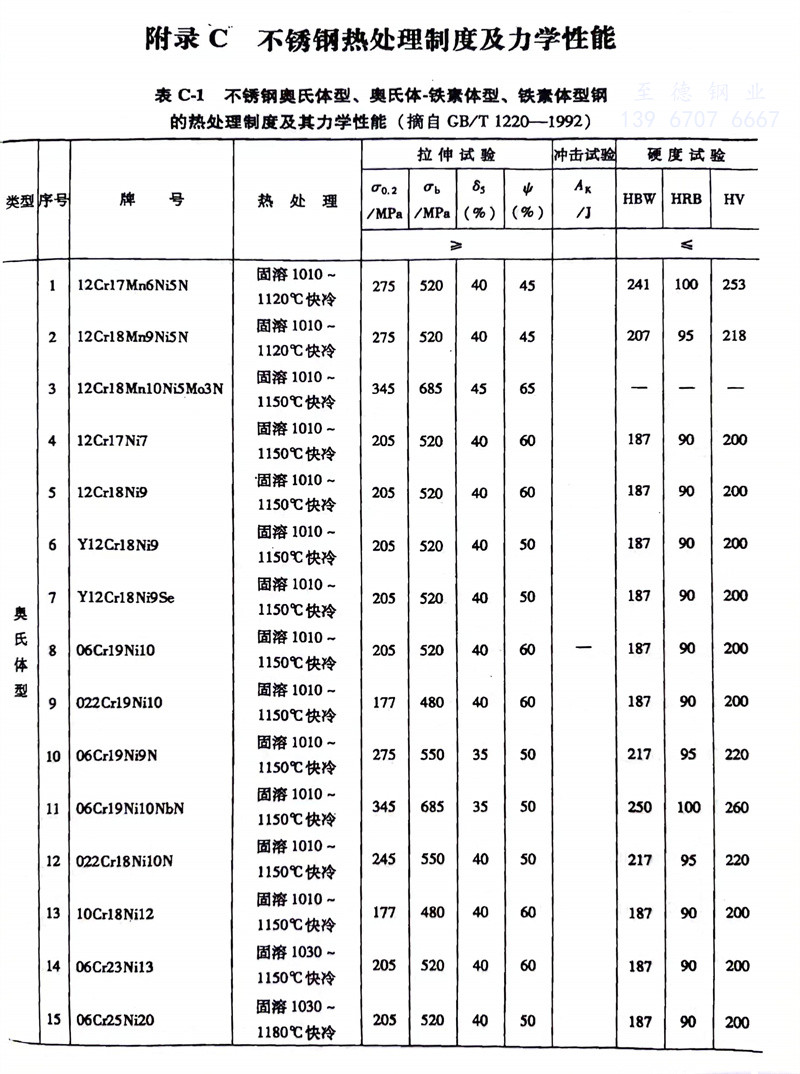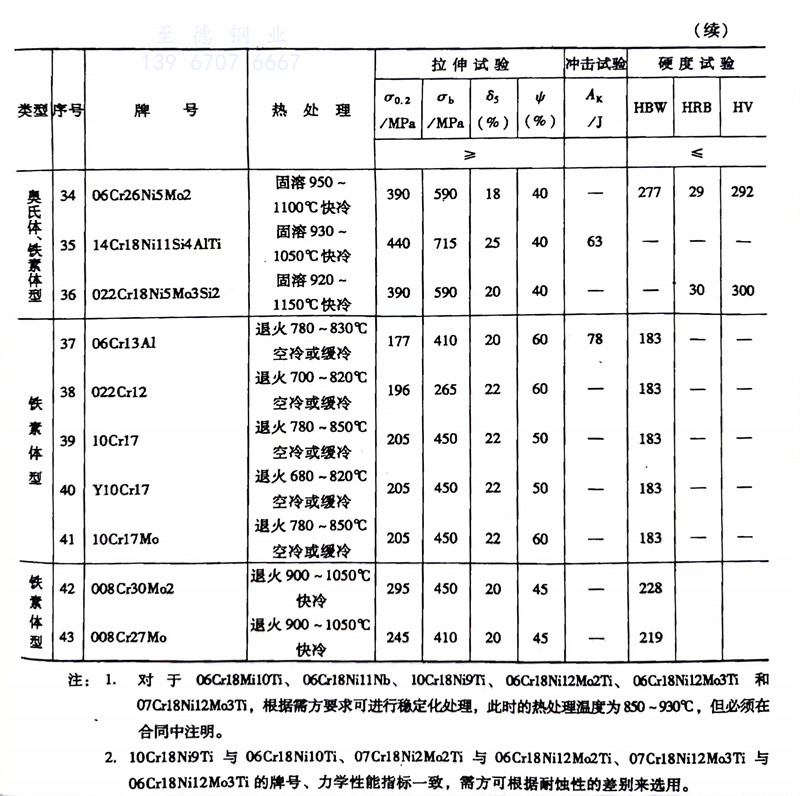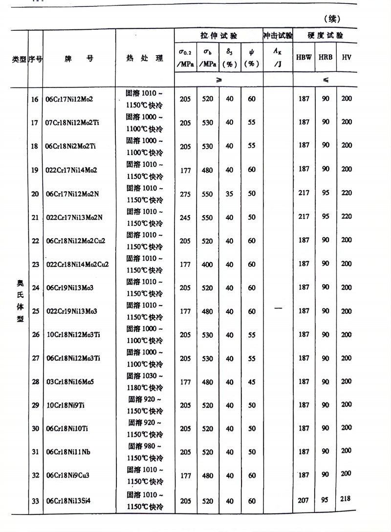 注(zhu)(zhu): 1.對于 06Cr18Ni10Ti、06C18Ni11Nb、10Cr18Ni9Ti、06Cr18Ni12Mo2Ti、06Cr18Ni12Mo3Ti 和 07Cr18Ni12Mo3Ti,根據儒方要求(qiu)可進(jin)行穩定化處(chu)理(li),此時(shi)的熱處(chu)理(li)溫度為850~930℃,但必須在(zai)合同中(zhong)注(zhu)(zhu)明(ming)。