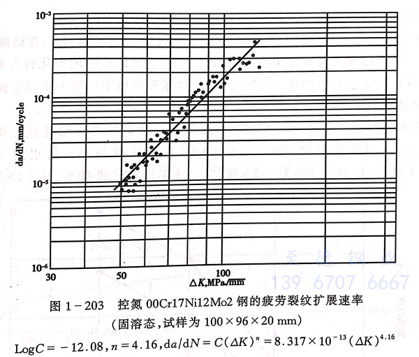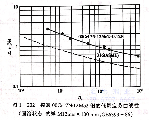 ( 控氮00C17N12Mo2)316NG不銹鋼(gang)的室溫疲勞性能見圖 1-202 和 圖 1-203 。其疲勞性能優于316L不銹鋼(gang) 。